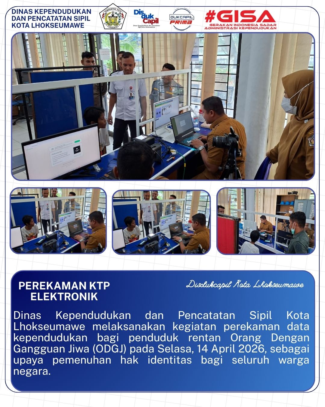 Dinas Kependudukan dan Pencatatan Sipil Kota Lhokseumawe melaksanakan kegiatan perekaman data kependudukan bagi penduduk rentan Orang Dengan Gangguan Jiwa (ODGJ) pada Selasa, 14 April 2026, sebagai upaya…
