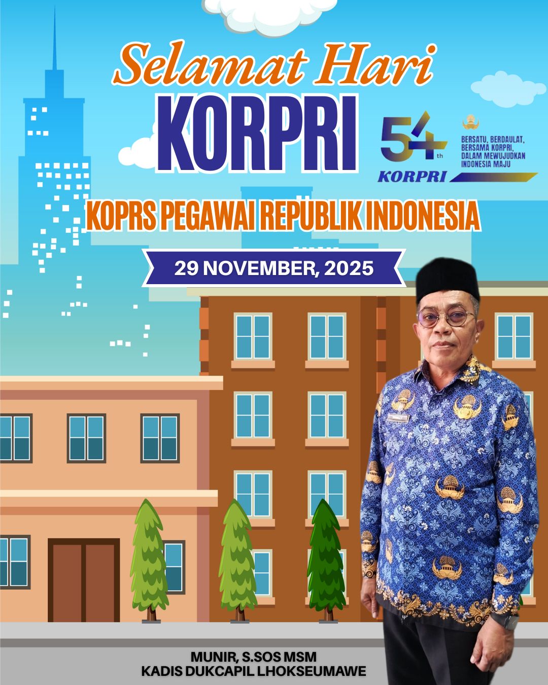 Selamat Hari KORPRI ke-54, 29 November 2025. Semoga KORPRI semakin profesional, berintegritas, dan terus menjadi pilar kuat dalam mewujudkan pelayanan publik yang berkualitas.Semoga seluruh ASN semakin solid, inovatif, dan adaptif menghadapi tantangan zaman.